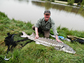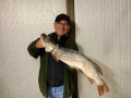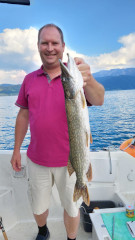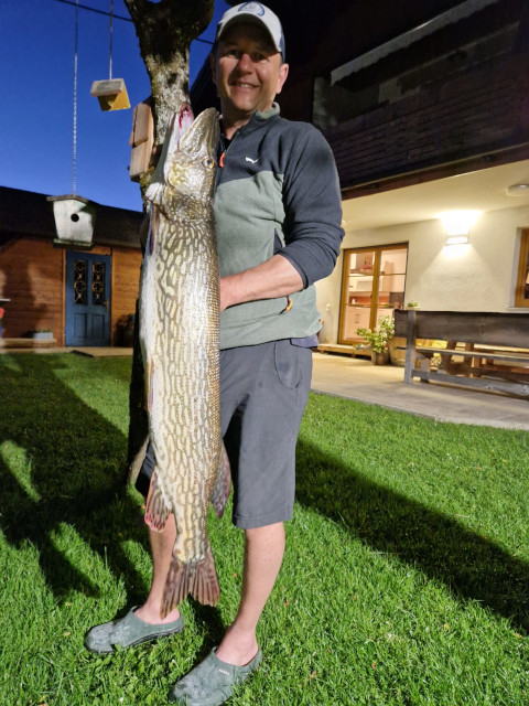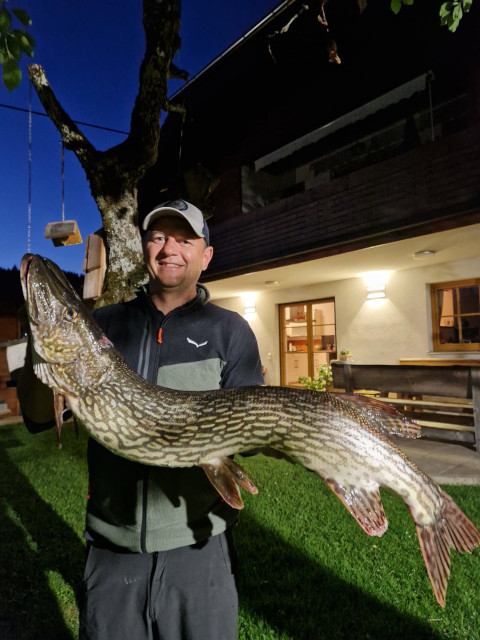 Attersee, 05. Oktober 2023 Seinen bereits vierten Meter-Hecht im heurigen Jahr holte Sigi Rastinger aus dem Attersee. Diesmal einen mit eimem besonders großen Kopf, mit 104 cm und 8 Kg.